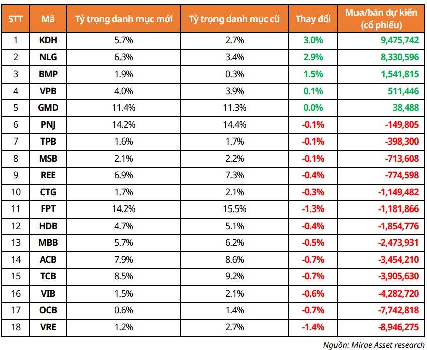 Mirae Asset ước tính chỉ có số ít cổ phiếu được mua vào nhằm gia tăng tỷ trọng đáng kể đó chính là KDH (9,5 triệu cổ phiếu), NLG (8,3 triệu cổ phiếu) và BMP (1,5 triệu cổ phiếu). Các mã VPB và GMD cũng được gom nhẹ.