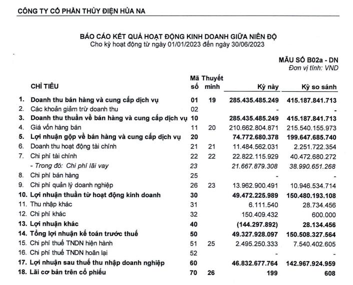 Về hoạt động kinh doanh, theo báo cáo soát xét bán niên 2023, nửa đầu năm nay, Thủy điện Hủa Na ghi nhận doanh thu đạt 285,44 tỷ đồng, giảm 31,3% so với cùng kỳ.