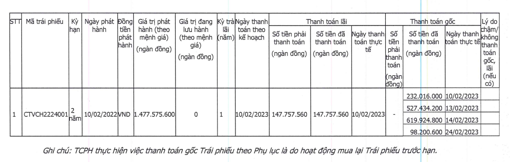 Về lô trái phiếu mua trước hạn, tháng 2/2022, Cá tầm Việt Nam phát hành lô trái phiếu mã CTVCH2224001 với tổng giá trị gần 1.478 tỷ đồng. Kỳ hạn của trái phiếu là 24 tháng, tính từ ngày 10/02/2022 đến 10/02/2024, lãi suất phát hành cố định 10%/năm.