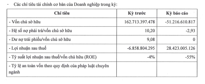 Tuy nhiên, nợ phải trả của doanh nghiệp vẫn còn khoảng 150 tỷ đồng. Với việc vốn chủ sở hữu âm, hệ số lợi nhuận sau thuế/vốn chủ sở hữu (ROE) cũng giảm từ âm 4% xuống âm 55%.