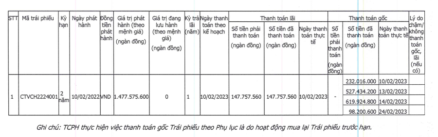 Sau đó một năm, vào đầu tháng 02/2023, lô trái phiếu ngàn tỷ trên đã được Cá tầm Việt Nam mua lại toàn bộ. Hiện, công ty không còn dư nợ trái phiếu nào.