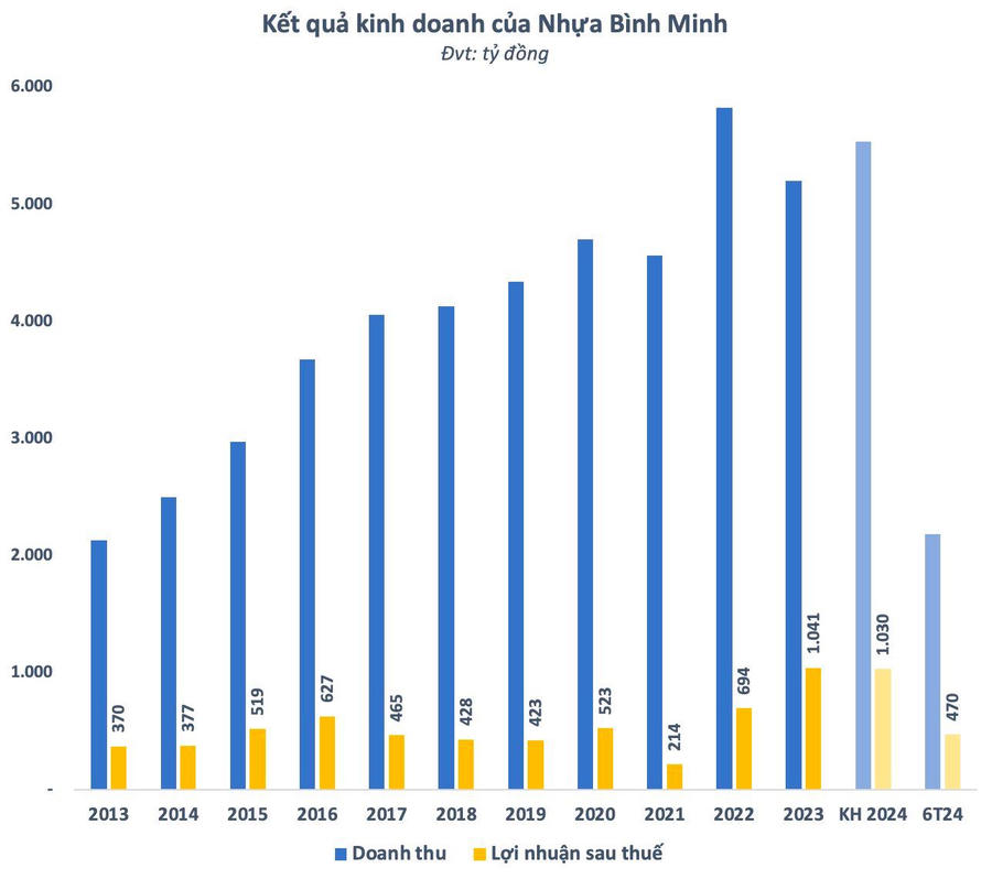 Năm nay, Nhựa Bình Minh lên kế hoạch kinh doanh với mục tiêu doanh thu 5.540 tỷ đồng, tăng 6,5% so với năm 2023. Lợi nhuận sau thuế dự kiến 1.030 tỷ đồng, gần như đi ngang so với thực hiện năm ngoái. Nếu hoàn thành kế hoạch đề ra, Nhựa Bình Minh sẽ có năm thứ 2 liên tiếp lãi nghìn tỷ.