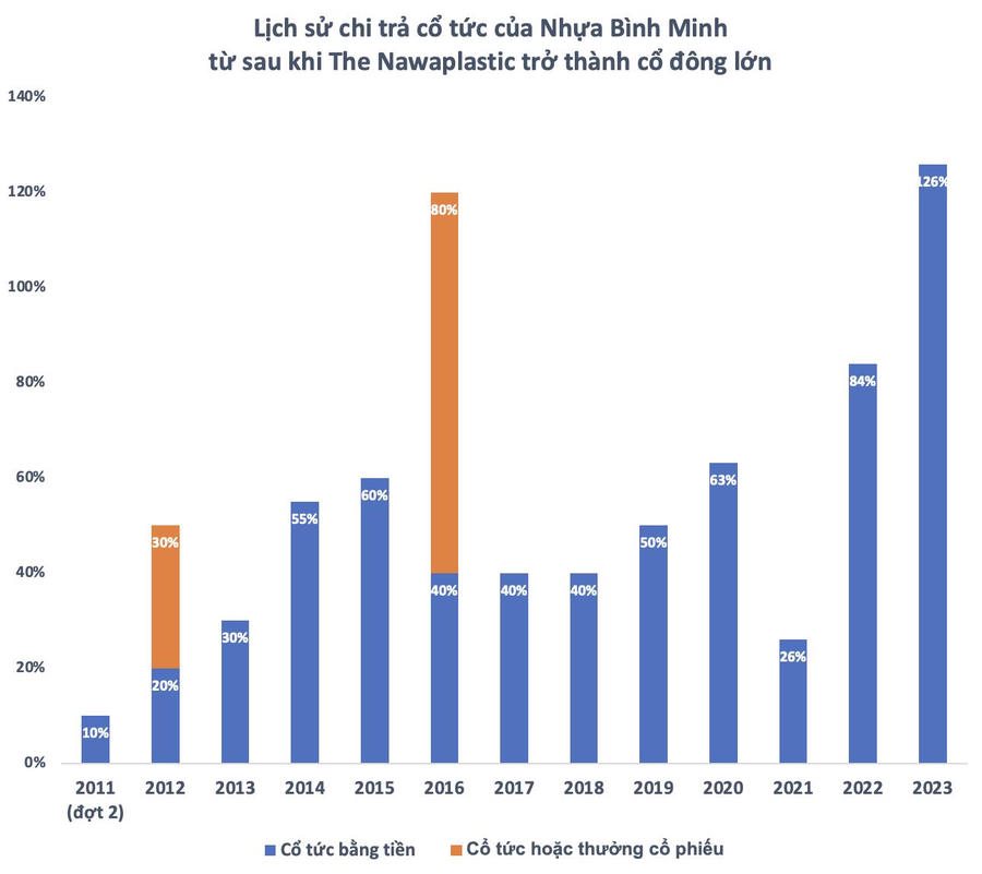 Không những thế, SCG còn “vớ bẫm” cổ tức từ Nhựa Bình Minh. Từ năm 2012 đến nay, chưa năm nào doanh nghiệp này quên chia cổ tức bằng tiền. Năm 2023, doanh nghiệp chia cổ tức kỷ lục với tỷ lệ 126% bằng tiền, trong đó cổ đông Thái Lan bỏ túi gần 570 tỷ đồng. Ước tính, tổng số tiền cổ tức SCG thu về từ khi trở thành cổ đông lớn của Nhựa Bình Minh đã lên đến gần 2.100 tỷ đồng.