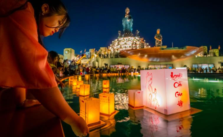 Sau nghi thức dâng đăng, du khách sẽ di chuyển xuống khu vực tôn tượng Bồ Tát Di Lặc, xem show nhạc nước sử dụng các thiết bị công nghệ hiện đại hàng đầu Việt Nam cùng hệ thống 1.450 đèn chiếu sáng vô cùng ảo diệu.