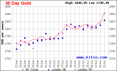 Thị trường vàng quốc tế trong một tháng qua cũng ghi nhận sự biến động không nhỏ, khi giá vàng vượt đỉnh 1.800 USD/ounce và vẫn tiếp tục đà tăng. Ghi nhận vào lúc 12h ngày 22/7, giá vàng giao ngay tại châu Á qua niêm yết của Kitco.com tăng tới 19,4 USD, giao dịch ở mức 1.860 USD/ounce.