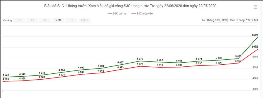 Giá vàng đã liên tục tăng mạnh trong suốt một tháng qua.Trong một tháng qua, giá vàng trong nước chỉ ghi nhận 2 phiên giảm nhẹ vào ngày 12 và 14/7. Trong diễn biến đó, nếu như ngày 26/6, giá vàng giao dịch ở mức 48,8 - 49,2 triệu đồng/lượng (mua vào - bán ra) thì đến ngày 22/7 tăng khoảng 4 triệu đồng/lượng ở cả 2 chiều.