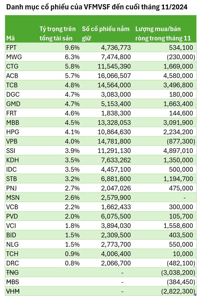 Tại thời điểm cuối tháng 11/2023, danh mục đầu tư của VFMVSF gồm 24 cổ phiếu có trị giá hơn 6.300 tỷ đồng. Chiếm tỷ trọng lớn nhất là FPT, MWG, CTG, ACB, TCB…