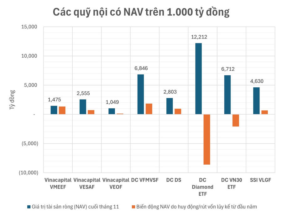 Một số quỹ nội địa do Dragon Capital và VinaCapital quản lý đã hút ròng được vài trăm đến cả nghìn tỷ đồng trong tháng 11 - vượt xa số tiền rút khỏi 2 quỹ ETF nội chủ chốt là DCVFM VNDIAMOND và DCVFM VN30.