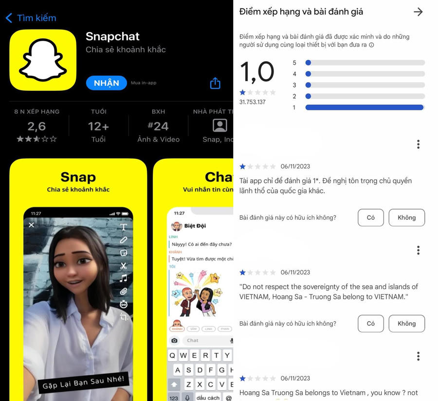 Điểm đánh giá của Snapchat trên App Store chỉ còn 2,6 sao và trên CH Play chỉ 1 sao, với số lượng đánh giá 1 sao áp đảo.