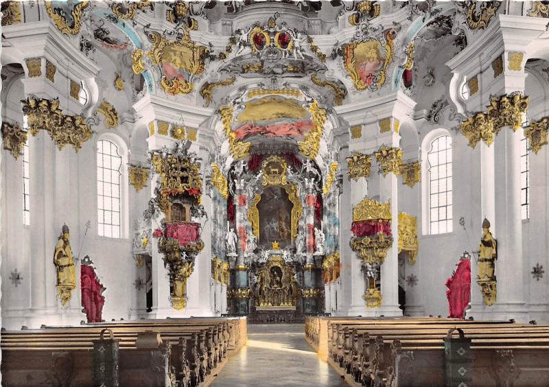 Nội thất của nhà thờ cũng mang đậm dấu ấn của trường phái Wessobrunner kết hợp với tượng trang trí nội thất chạm nổi (stucco) truyền thống mang ý nghĩa giúp cho các hiện tượng siêu nhiên có thể nhìn thấy được. Nói một cách đơn giản, các bức tượng điêu khắc là những bức bích họa trong nhà thờ diễn tả sâu sắc tính thần thánh rõ nét trên từng chi tiết. Những bức tượng chạm trổ màu trắng được mạ vàng tỉ mỉ tạo điểm nhấn làm bật lên vẻ đẹp nhiệm màu của đấng tối cao.