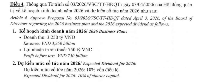 Năm 2026, VSC đặt mục tiêu doanh thu đạt 3.250 tỷ đồng, lãi trước thuế đạt 750 tỷ đồng. Công ty dự kiến mức trả cổ tức năm 2026 là 10%.
