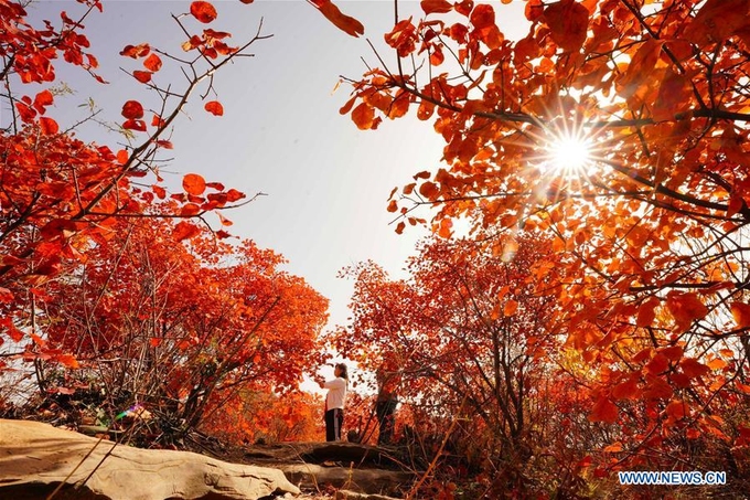 Du khách ngắm cảnh mùa thu lá đỏ ở núi Hongfeng, thành phố Sa Hà, tỉnh Hà Bắc, miền bắc Trung Quốc ngày 22/10.
