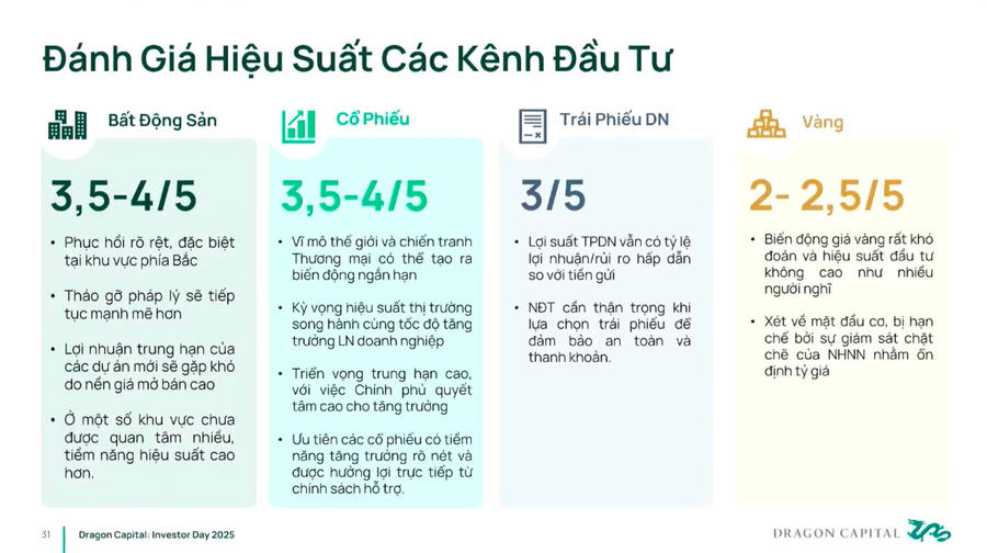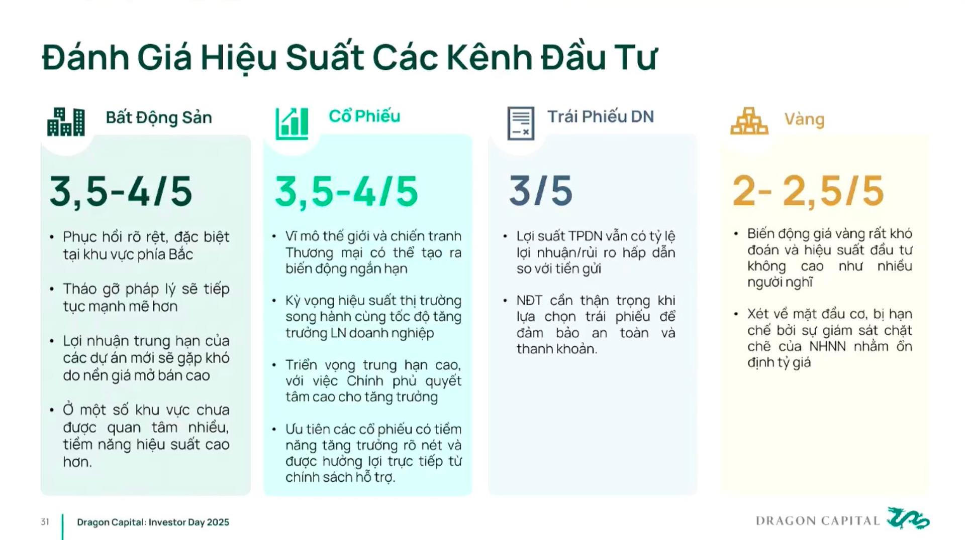Tại sự kiện Investor Day 2025 do Dragon Capital tổ chức, ông Lê Anh Tuấn – Giám đốc đầu tư Dragon Capital đánh giá hiệu suất 4 kênh tài sản đầu tư, bao gồm bất động sản, chứng khoán, trái phiếu doanh nghiệp (TPDN) trên thang điểm tối đa là 5.