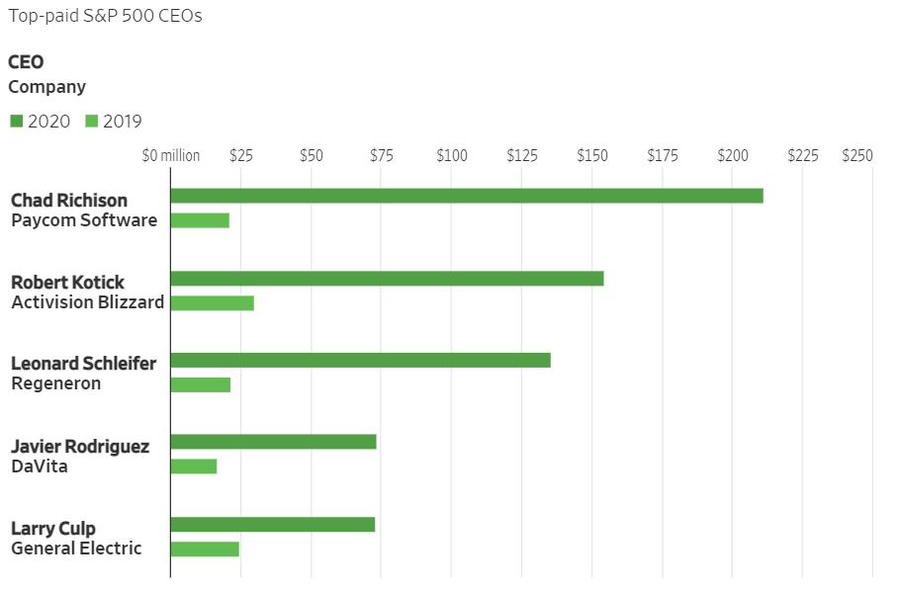 Chad Richison, người sáng lập Paycom Software là CEO nhận lương cao nhất nhóm S&P 500 khi thu về hơn 200 triệu USD. Thống kê cho thấy có 7 CEO được trả lương hơn 50 triệu USD vào năm 2020, trong khi năm 2019 và 2018 chỉ có lần lượt 2 và 3 người vượt qua mốc này.