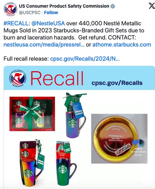 Ủy ban An toàn sản phẩm tiêu dùng Mỹ (CPSC) ngày 22/3 đã yêu cầu thu hồi hơn 440.000 chiếc cốc nhãn hiệu Starbucks do hãng Nestle sản xuất và bán trong kỳ nghỉ đông vừa qua sau khi một số người dùng phản hồi họ đã bị bỏng hoặc rách da khi sử dụng sản phẩm này.