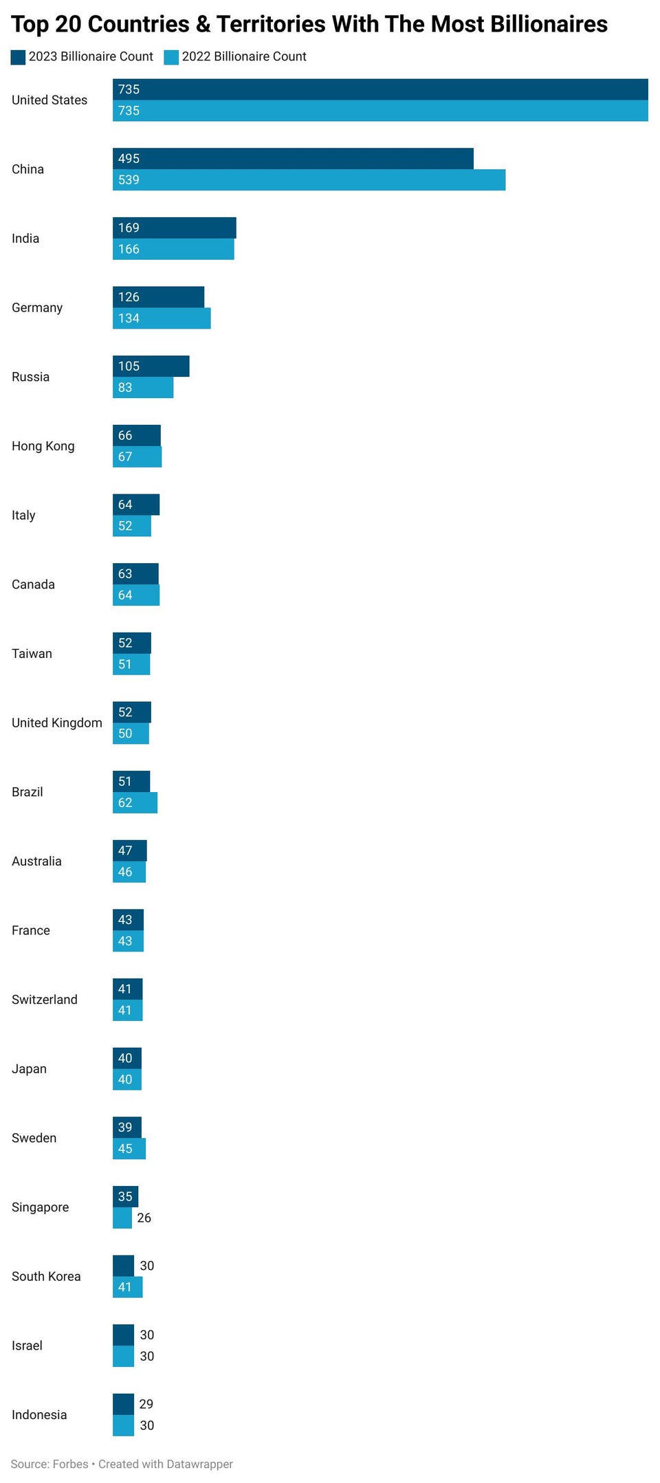 Theo thống kê của Forbes, năm 2023 ghi nhận có 2.640 tỷ phú trên thế giới, tới từ 77 quốc gia và vùng lãnh thổ trên toàn cầu, tăng so với con số 75 của năm ngoái.