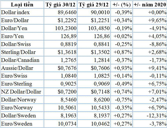 Phiên 30/12, đồng USD giảm 0,39% so với rổ tiền tệ, theo đó chỉ số dollar index chỉ còn 89,65 vào cuối phiên, trong phiên có lúc chỉ 89,56, mức thấp nhất kể từ tháng 4/2018. Khối lượng giao dịch ít vì đang kỳ nghỉ Giáng sinh và Năm mới.