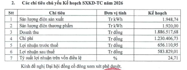Cụ thể, sản lượng điện mục tiêu 1,92 tỷ kWh, giảm 19,29%; doanh thu kế hoạch 1.886 tỷ đồng, giảm gần 20%; lãi sau thuế đạt gần 584 tỷ đồng, giảm 32% so với năm ngoái.