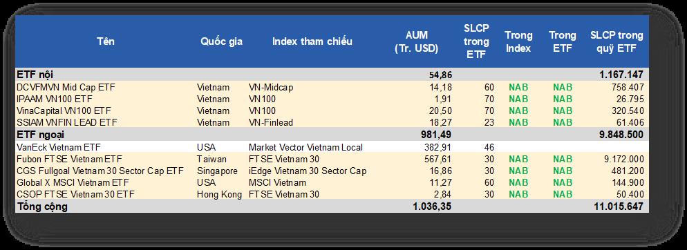 Hiện nay, ngoài VNM ETF và Fubon FTSE Vietnam ETF, Nam A Bank còn thu hút dòng vốn từ nhiều quỹ ETF quốc tế đến từ Singapore, Đài Loan, Hong Kong, Mỹ cũng như các quỹ nội như DCVFMVN Mid Cap ETF, Vina Capital VN 100 ETP.