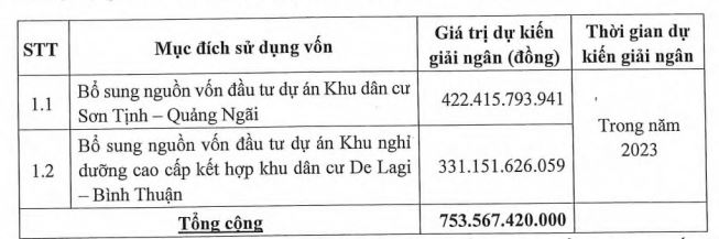 Theo kế hoạch, tổng số tiền tối thiểu thu từ chào bán số cổ phiếu trên là hơn 753 tỷ đồng sẽ được NBB dùng cho việc bổ sung vốn tại các dự án trong năm 2023 như dự án Khu dân cư Sơn Tịnh - Quảng Ngãi (thêm 422 tỷ đồng) và dự án Khu nghỉ dưỡng cao cấp kết hợp Khu dân cư Lagi - Bình Thuận (thêm 331 tỷ đồng).