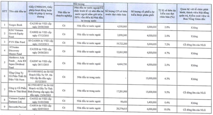 Nam Long dự kiến sẽ chào bán cho khoảng 9 nhà đầu tư chuyên nghiệp, trong đó có nhiều quỹ ngoại thuộc nhóm Dragon Capital, PYN Elite, KIM Vietnam Growth Equity Fund thuộc KIM… Tính đến ngày 19/5, tỷ lệ sở hữu của khối ngoại đã lên đến 44,07%, trong khi tỷ lệ tối đa là 50%. Công ty cam kết sẽ đảm bảo đúng quy định về tỷ lệ sở hữu tối đa của nhà đầu tư nước ngoài trong đợt chào bán này.