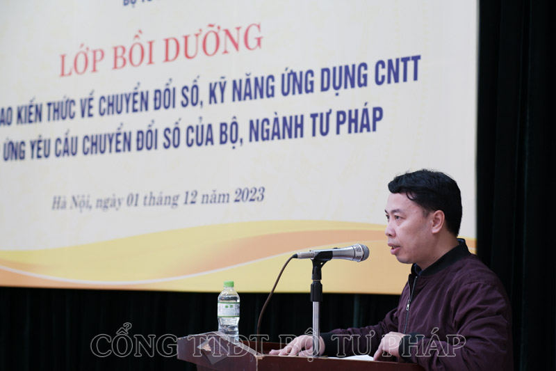Triển khai Quyết định số 2691/QĐ-BTP ngày 09/11/2023 của Bộ trưởng Bộ Tư pháp về việc mở Lớp Bồi dưỡng, nâng cao kiến thức về chuyển đổi số, kỹ năng ứng dụng công nghệ thông tin đáp ứng yêu cầu chuyển đổi số của Bộ, ngành Tư pháp, Cục Công nghệ thông tin được giao phối hợp với Vụ Tổ chức cán bộ triển khai 02 Lớp bồi dưỡng nhằm nâng cao kiến thức về chuyển đổi số, kỹ năng ứng dụng công nghệ thông tin đáp ứng yêu cầu chuyển đổi số của Bộ, ngành Tư pháp.