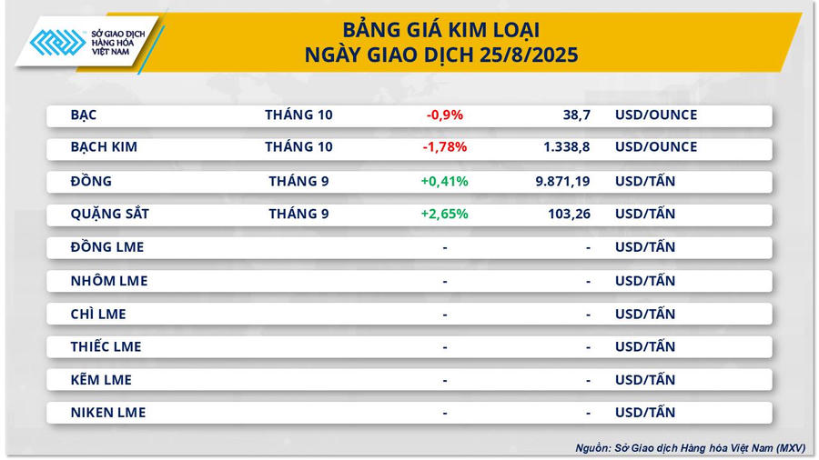Theo MXV, phiên giao dịch hôm qua ghi nhận diễn biến phân hóa rõ nét khi nhóm kim loại quý chịu áp lực bán mạnh, trong khi phần lớn kim loại cơ bản duy trì xu hướng tích cực. Tâm điểm là quặng sắt, khi giá hợp đồng kỳ hạn tháng 9 trên sàn Singapore đảo chiều tăng 2,65% lên 103,26 USD/tấn, xóa đi nhịp giảm trước đó nhờ thông tin bất ngờ từ nguồn cung.