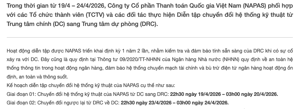 Về phía Napas, đơn vị này xác nhận việc chuyển đổi hệ thống từ Trung tâm dữ liệu chính (DC) sang Trung tâm dự phòng (DRC) và ngược lại sẽ được triển khai trong hai giai đoạn: từ 22h30 ngày 19/4 đến 3h ngày 20/4 và từ 22h30 ngày 23/4 đến 3h ngày 24/4.