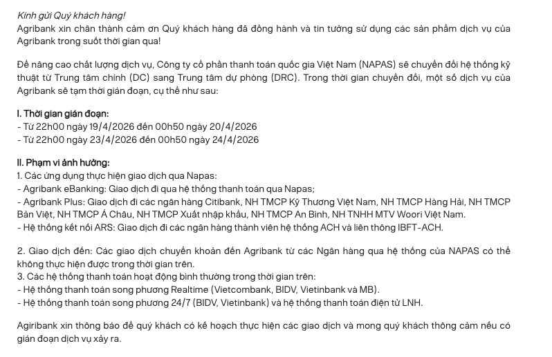 Theo Ngân hàng Nông nghiệp và Phát triển Nông thôn Việt Nam (Agribank), một số giao dịch qua hệ thống Napas sẽ tạm thời bị gián đoạn trong hai khung giờ: từ 22h ngày 19/4 đến 0h50 ngày 20/4 và từ 22h ngày 23/4 đến 0h50 ngày 24/4. Các dịch vụ bị ảnh hưởng bao gồm chuyển tiền trên nền tảng ngân hàng số như eBanking, Agribank Plus và các kết nối qua hệ thống ARS.
