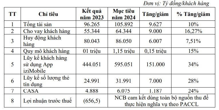 Theo tài liệu ĐHĐCĐ, NCB lên kế hoạch kinh doanh năm 2024 với mục tiêu tăng trưởng cho vay khách hàng năm đạt 16,27% lên 64.344 tỷ đồng, huy động khách hàng tăng 7,51% lên 86.050 tỷ đồng, tổng tài sản tăng 10% lên 105.892 tỷ đồng. Quy mô khách hàng dự kiến tăng 15% từ 1 triệu lên 1,15 triệu khách.