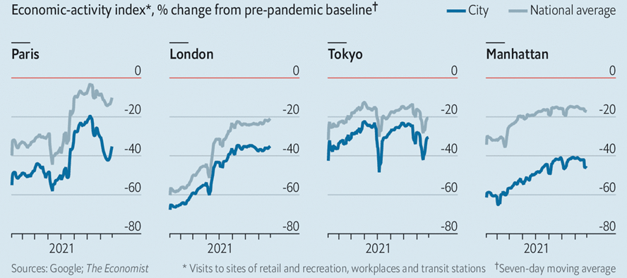 Một cách để “bắt mạch” các thành phố lớn là sử dụng chỉ số di chuyển theo thời gian thực. Tờ The Economist xây dựng một công cụ gọi là "chỉ số hoạt động kinh tế" bằng cách sử dụng dữ liệu của Google về số lượt đi đến các địa điểm bán lẻ và giải trí, phương tiện giao thông công cộng và công sở, đồng thời so sánh mức độ này giữa các thành phố lớn với phần còn lại của quốc gia tương ứng. Kết quả: ở Mỹ, Anh, Pháp và Nhật Bản, mức độ hoạt động ở các thành phố lớn vẫn thấp hơn đáng kể so với các nơi khác trên toàn quốc.