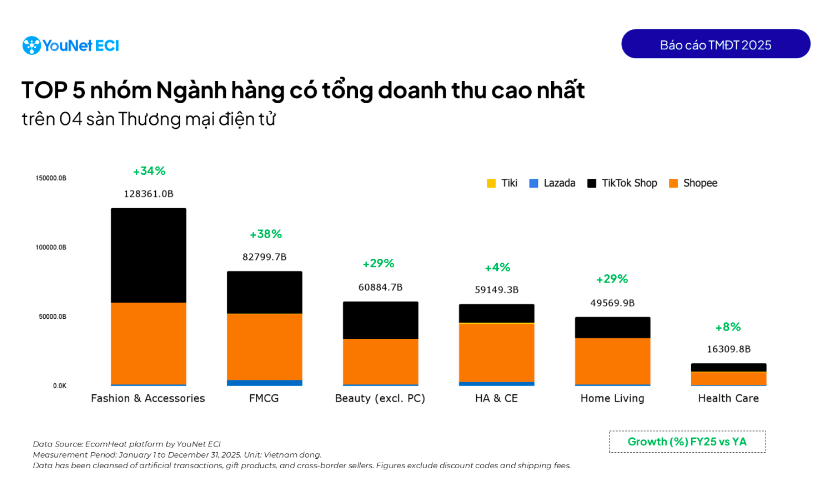 Thứ hai, nhóm ngành Tiêu dùng nhanh (FMCG) đạt mức tăng trưởng 38% trong năm 2025, trở thành ngành hàng lớn thứ hai trên TMĐT.