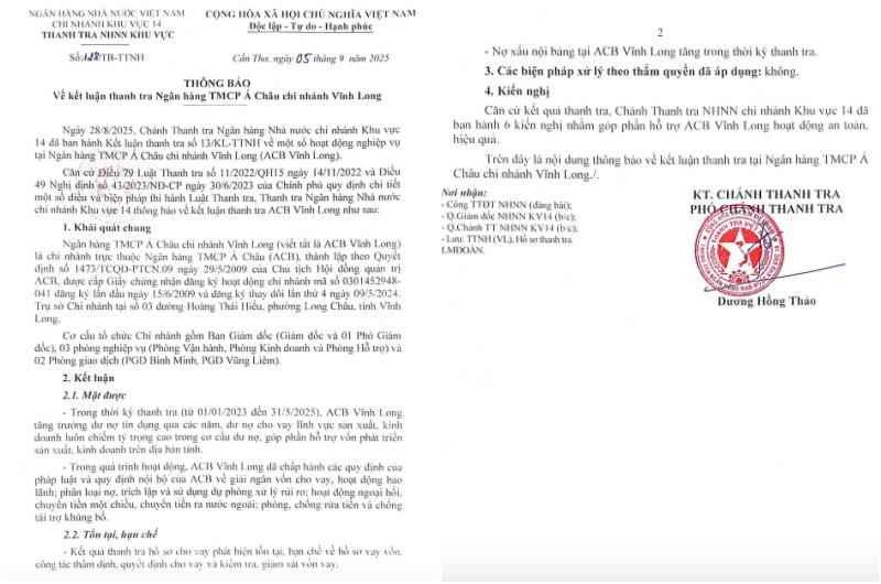Ngày 5/9/2025, Thanh tra Ngân hàng Nhà nước Việt Nam Khu vực 14 ban hành văn bản số 128/TB-TTNH thông báo kết luận thanh tra Ngân hàng TMCP Á Châu chi nhánh Vĩnh Long (ACB Vĩnh Long).
