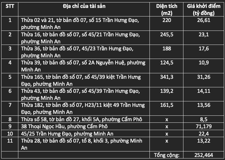 Tính theo giá khởi điểm, tổng giá trị của các tài sản này là hơn 250 tỷ đồng; tài sản thấp nhất là 8,5 tỷ đồng và tài sản cao nhất có giá trị gần 72 tỷ đồng.
