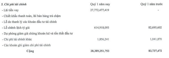Công ty cho biết chi phí tài chính tăng đột biến do chi phí lãi vay ghi nhận 27,77 tỷ đồng so với cùng kỳ không ghi nhận.