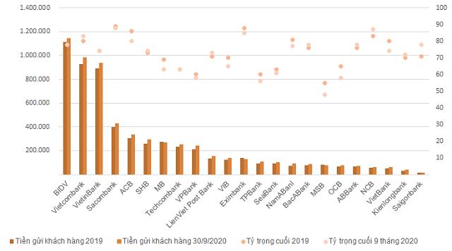 Thống kê của Người Đồng Hành với 24 ngân hàng cho thấy tiền gửi khách hàng chiếm tỷ trọng lớn nhất trong cơ cấu nguồn vốn, dao động 48-88%. Sacombank có tỷ lệ tiền gửi trên tổng nguồn vốn lớn nhất, chiếm 88%, tại thời điểm cuối tháng 9/2020. Sau 3 quý, khoản mục này tăng 7% so với đầu năm, ở mức 429 tỷ đồng.