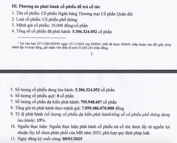Theo đó, MB sẽ phát hành gần 796 triệu cổ phiếu để trả cổ tức cho cổ đông hiện hữu. Nguồn phát hành được lấy từ lợi nhuận luỹ kế chưa phân phối năm 2023 của ngân hàng đã được Đại hội đồng cổ đông thường niên 2024 thông qua.