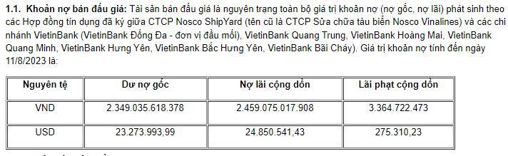 Giá trị khoản nợ đấu giá dư nợ gốc là 2.349 tỷ đồng và 23,27 triệu USD. Ngân hàng đưa ra giá khởi điểm cho khoản nợ này là hơn 2.112,8 tỷ. Tiền đặt cọc trước bằng 20% giá khởi điểm tương đương 422,5 tỷ đồng.