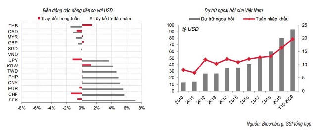 Nguồn cung ngoại tệ dồi dào, Ngân hàng Nhà nước tiếp tục mua vào lượng lớn ngoại tệ, dữ trữ ngoại hối hướng gần hơn đến mục tiêu 100 tỷ USD vào cuối 2020 mà Chính phủ đã đưa ra. Bởi vậy, SSI Research cho rằng xu hướng đi ngang của tỷ giá USD/VND sẽ tiếp tục được duy trì.