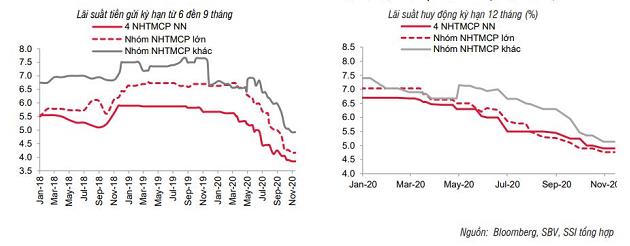 Lãi suất tiền gửi giữ ở mức 2,5-3,8%/năm với kỳ hạn dưới 6 tháng, 3,7-5%/năm với kỳ hạn 6 đến dưới 12 tháng, 4,9-5,8%/năm với kỳ hạn 12,13 tháng. Thanh khoản các NHTM vẫn dồi dào dù đã bước vào mùa cao điểm cuối năm và SSI Research dự báo lãi suất sẽ tiếp tục đi ngang.
