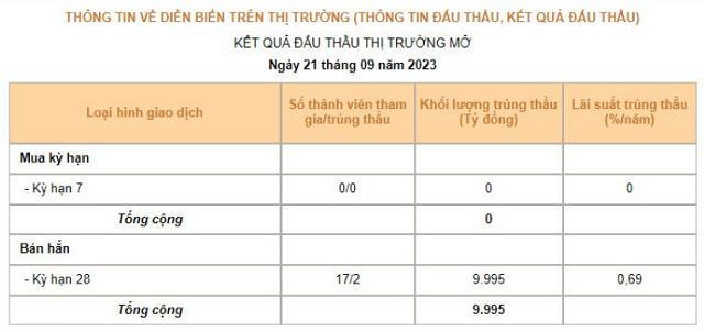 Trước đó, trong phiên ngày 21/9, Nhà điều hành cũng đã chào thầu thành công gần 9.995 tỷ đồng tín phiếu cho 2 thành viên thị trường với kỳ hạn 28 ngày, lãi suất 0,69%; qua đó rút khỏi hệ thống ngân hàng lượng tiền tương ứng.
