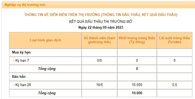 Theo kết quả đấu thầu, Ngân hàng Nhà nước đã phát hành 10.000 tỷ đồng tín phiếu với lãi suất trúng thầu đạt 0,5%/năm, thấp hơn phiên ngày 21/9 là 0,69%.