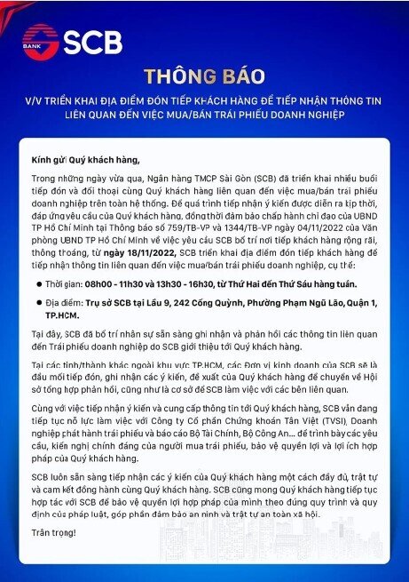 Chiều tối ngày 16/11, Ngân hàng TMCP Sài Gòn (SCB) thông báo việc triển khai bố trí địa điểm đón tiếp khách hàng để tiếp nhận thông tin liên quan đến mua/bán trái phiếu doanh nghiệp.