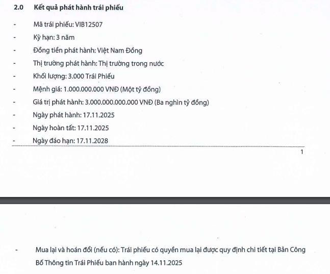 Theo đó, ngày 17/11/2025 vừa qua, VIB đã phát hành thành công 3.000 trái phiếu mã VIB12507 ra thị trường trong nước. Với mệnh giá 1 tỷ đồng/trái phiếu, lô trái phiếu có tổng giá trị phát hành lên đến 3.000 tỷ đồng, kỳ hạn 3 năm, dự kiến đáo hạn vào ngày 17/11/2028.