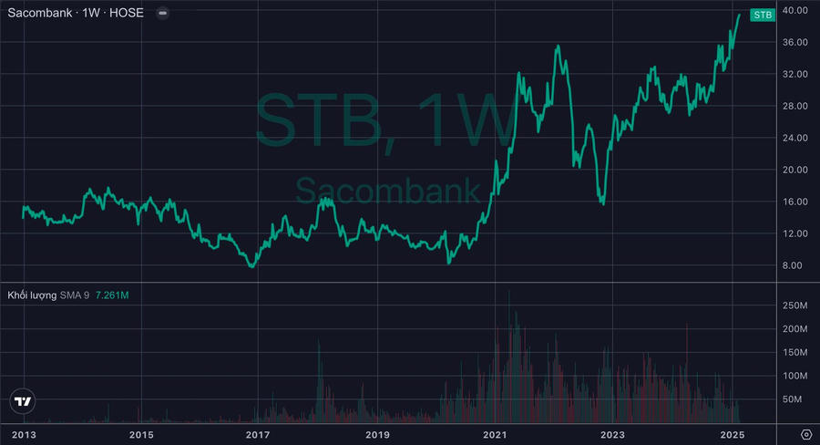 Cổ phiếu STB của Sacombank – ngân hàng Việt Nam đầu tiên lên sàn chứng khoán vừa có phiên bứt phá ngoạn mục để lập đỉnh mới. Đóng cửa phiên 24/2, thị giá STB dừng ở mức 39.400 đồng/cp, tăng gần 29% sau một năm. Vốn hóa thị trường của Sacombank cũng theo đó lập kỷ lục mới hơn 74.000 tỷ đồng (~3 tỷ USD).