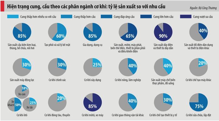 Theo số liệu của Bộ Công Thương, hiện nay, ngành cơ khí Việt Nam có thế mạnh tập trung ở ba phân ngành gồm xe máy và phụ tùng linh kiện xe máy; cơ khí gia dụng và dụng cụ; ôtô và phụ tùng ôtô. Ba phân ngành này chiếm gần 70% tổng giá trị sản xuất công nghiệp của cơ khí cả nước.