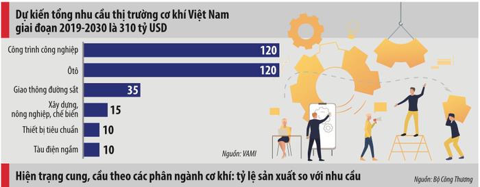 Đó là giá trị máy móc, thiết bị, cấu kiện cho các công trình nhiệt điện, thủy điện, hóa chất, khai thác, chế biến khoáng sản (khoảng 120 tỷ USD); máy xây dựng, nông nghiệp và chế biến nông, lâm sản (15 tỷ USD); các loại thiết bị tiêu chuẩn, như quạt, động cơ, thiết bị thủy lực... (khoảng 10 tỷ USD), thiết bị cho đường sắt tốc độ cao (khoảng 35 tỷ USD), đường sắt đô thị (10 tỷ USD) và công nghiệp ôtô (120 tỷ USD). Đó là thị trường "mơ ước" đủ lớn, để phát triển ngành cơ khí chế tạo.
