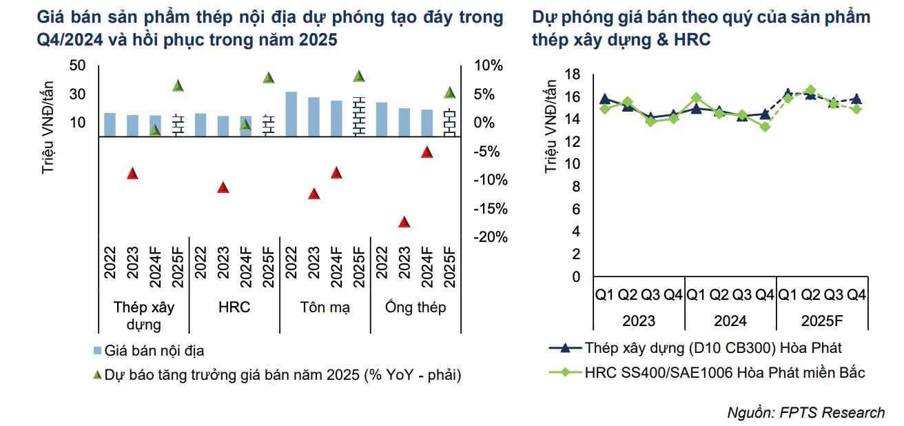 Theo FPTS, kết quả kinh doanh nhóm 8 doanh nghiệp niêm yết đại diện cho ngành (bao gồm HPG, HSG, NKG, GDA, SMC, TIS, TLH và VGS) dự phóng tăng trưởng tích cực. Tổng doanh thu thuần của nhóm doanh nghiệp năm 2025 dự phóng ở mức 301.400 tỷ đồng, tăng 18,6% so với năm 2024. Sản lượng bán hàng toàn ngành dự báo hồi phục 8,1% và giá bán nội địa trung bình cả năm tăng dao động từ 5,5% đến 8,5% tùy mặt hàng.