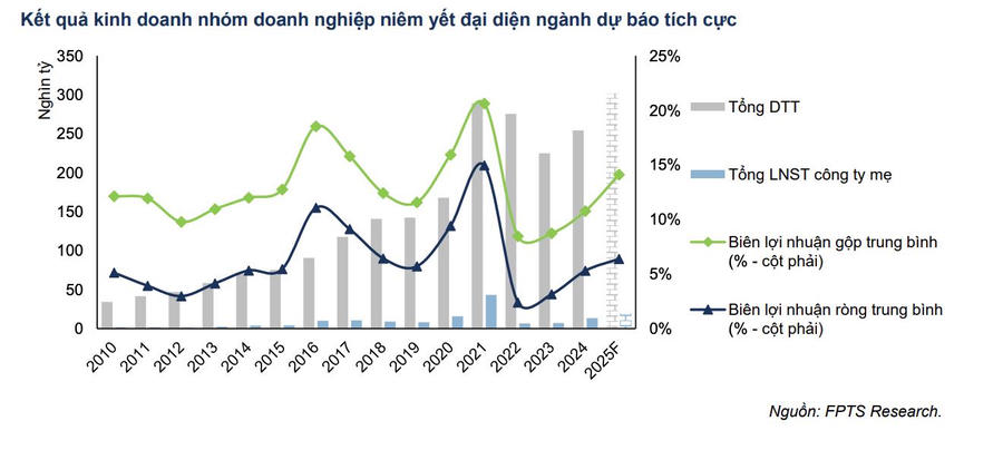 Tổng lợi nhuận sau thuế công ty mẹ của nhóm doanh nghiệp năm 2025 dự phóng ở mức 19.200 tỷ đồng, tăng 43,1% so với năm 2024. Mức dự phóng dựa trên luận điểm biên lợi nhuận gộp trung bình của nhóm doanh nghiệp năm 2025 đạt 14,1%.