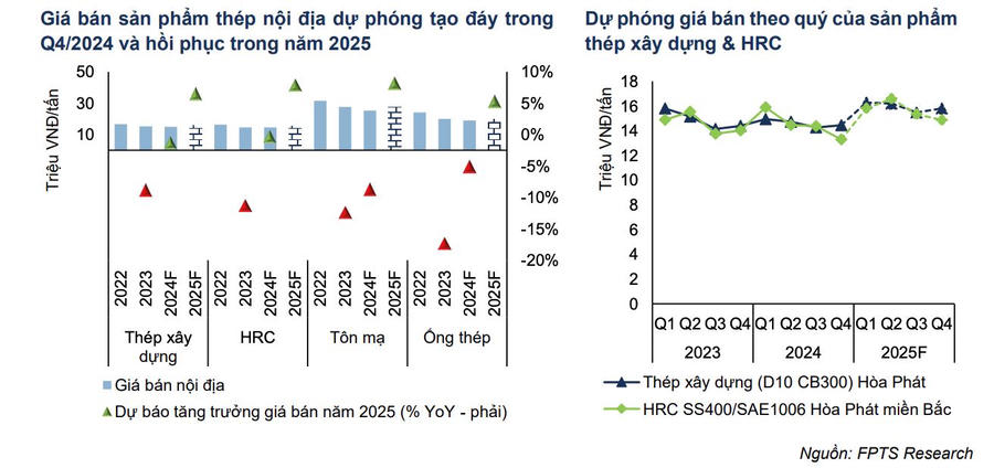 Chuyên gia FPTS dự báo sản lượng bán hàng sản phẩm thép toàn ngành năm 2025 là 32,5 triệu tấn, tăng 10,6% so với cùng kỳ. Điểm rơi tăng trưởng tiêu thụ thép dự báo trong hai quý đầu năm khi các dự án xây dựng dân dụng khởi công đầu năm cùng tồn kho ngành thấp khiến các đại lý đẩy mạnh gom hàng. Sản lượng nội địa dự báo đạt 23,8 triệu tấn, tăng 13,6% so với cùng kỳ và chiếm 73,3%. Đối với kênh xuất khẩu, tốc độ tăng trưởng năm 2025 dự báo ở mức 3,1% so với cùng kỳ, giảm tốc so với thực hiện cùng kỳ và tương đương 8,7 triệu tấn.